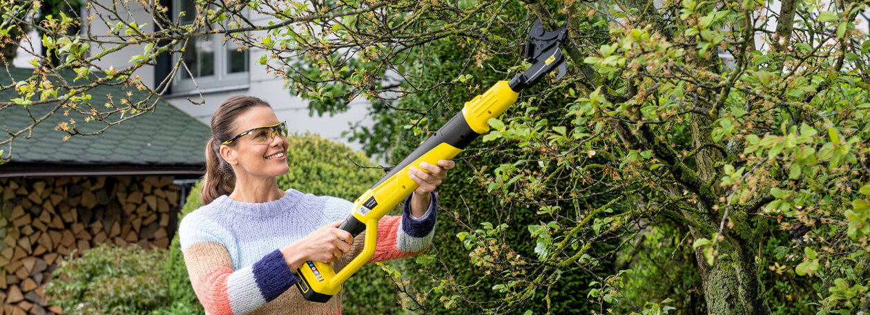 Cutting branches and twigs is now easier than ever before: With the Kärcher battery tree lopper and battery pruning saw, uncontrolled growth can be quickly tamed. These powerful tools are easy on the joints and require no application of force to create new space for bushes, shrubs and trees to grow and flourish. Whether rose bushes, overgrown shrubs or young trees, you are always ready for action, even when you are far away from a power outlet, thanks to the powerful Kärcher Battery Power exchangeable batteries.