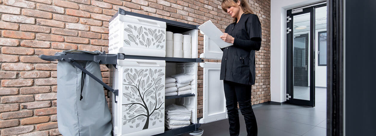 !Macht das Transportieren und Entsorgen leicht: Handtücher, Seife, Toilettenpapier und alle Reinigungsutensilien finden im Transportwagen Platz – sauber und sicher verstaut.!