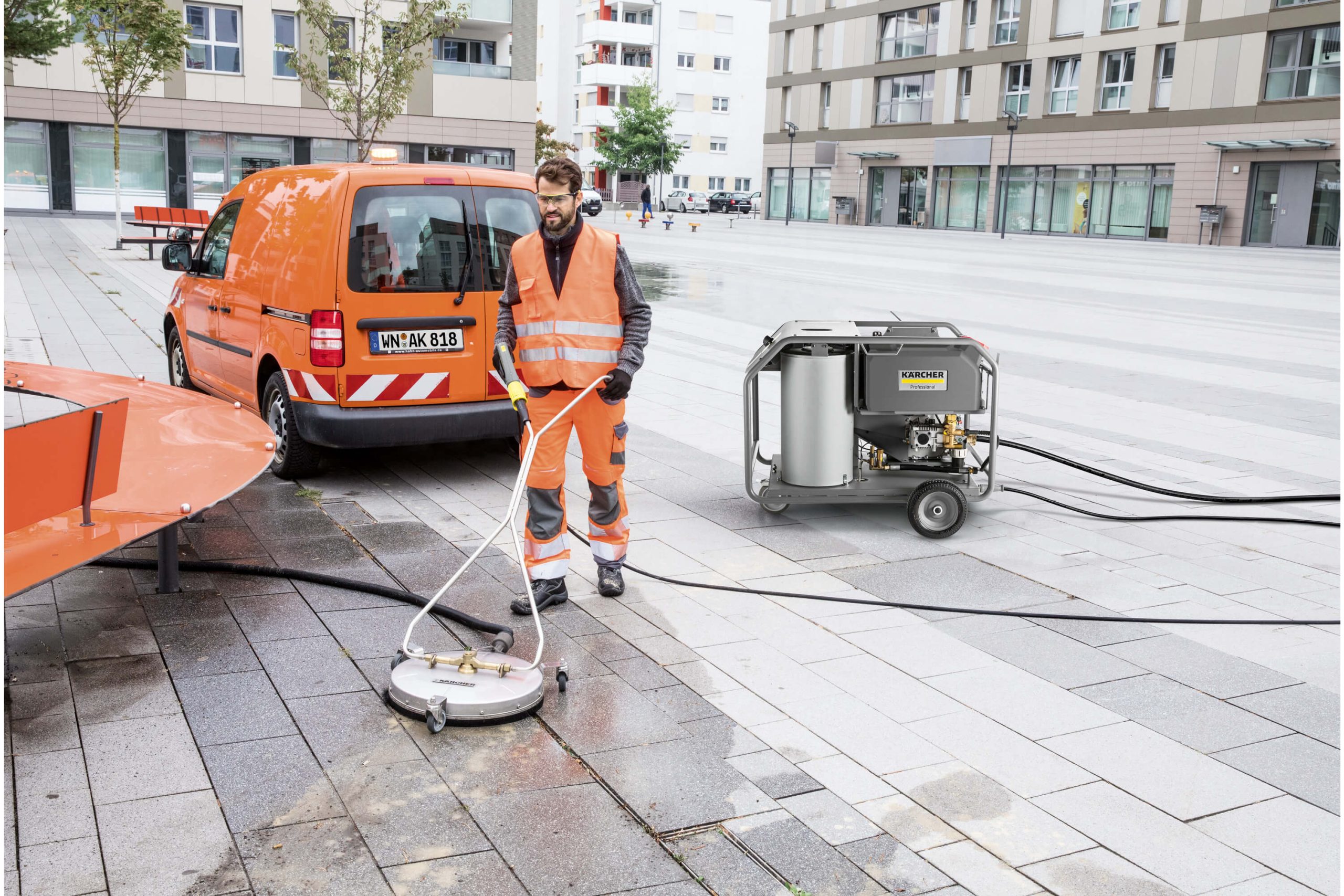 Το μηχάνημα καθαρισμού υψηλής πίεσης ζεστού νερού HDS 8/20 D διαθέτει ισχυρό κινητήρα ντίζελ με ηλεκτρική εκκίνηση, ισχυρή και ανθεκτική στροφαλοφόρο αντλία και μια πολύ αποτελεσματική τεχνολογία καυστήρα. Τα χαρακτηριστικά αυτά παρέχουν εξαιρετικά αποτελέσματα καθαρισμού ακόμα και σε πιο δύσκολες συνθήκες, όπως σε χώρους όπου δεν υπάρχει παροχή ηλεκτρικού ρεύματος. Είναι ιδανικό για εφαρμογές στον κατασκευαστικό τομέα, για τις δημοτικές αρχές ή για εργολάβους συντήρησης κτιρίων: το μηχάνημα παρέχει ποσότητα νερού 800 λίτρα ανά ώρα και 200 bar πίεση λειτουργίας κατά την αφαίρεση επίμονων ρύπων. Το ενσωματωμένο ρεζερβουάρ καυσίμου χωρητικότητας 20 λίτρων επιτρέπει στο μηχάνημα καθαρισμού υψηλής πίεσης να χρησιμοποιείται για μεγάλες χρονικές περιόδους. Η δοκιμασμένη τεχνολογία ασφαλείας, η οποία περιλαμβάνει θερμική βαλβίδα ασφαλείας, φίλτρο νερού, παρακολούθηση της θερμοκρασίας των καυσαερίων και σύστημα απόσβεσης (SDS), προστατεύει με αξιόπιστο τρόπο όλα τα σημαντικά εξαρτήματα, ενώ το στιβαρό σωληνοειδές πλαίσιο από χάλυβα προστατεύει το μηχάνημα από εξωτερικές ζημιές. Τα αδιάτρητα ελαστικά, οι τροχίσκοι/τα ροδάκια καθοδήγησης με χειρόφρενο, οι εργονομικές λαβές ώθησης και ο φιλικός προς τον χρήστη διακόπτης επιλογής ενός πλήκτρου περιλαμβάνονται επίσης στον βασικό εξοπλισμό. Εξαρτήματα όπως το λάστιχο υψηλής πίεσης και η κάνη μπορούν να αποθηκευτούν χωρίς κόπο απευθείας πάνω στο μηχάνημα.
